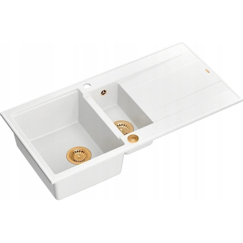 Graniteq Zlewozmywak GraniteQ EVAN 156 GraniteQ zlewozmywak z syfonem Push To Open 1,5-komorowy z/o (1000x500x210; kom. 420x480) snow white / elementy miedziane